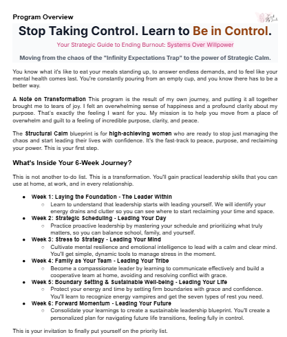 As a Life and Health Coach, I've seen countless moms trapped in the cycle of overwhelm, mistakenly believing that true control means endlessly doing more, sacrificing sleep, and constantly working. I know that feeling intimately. My mission is to help you bypass the years of struggle and go straight to the strategies that actually work. This program is your fast track to clarity and peace—it's the very blueprint I had to create for myself, now simplified and made direct for you. Consider my pain your shortcut, and I am honored to guide you on this journey.