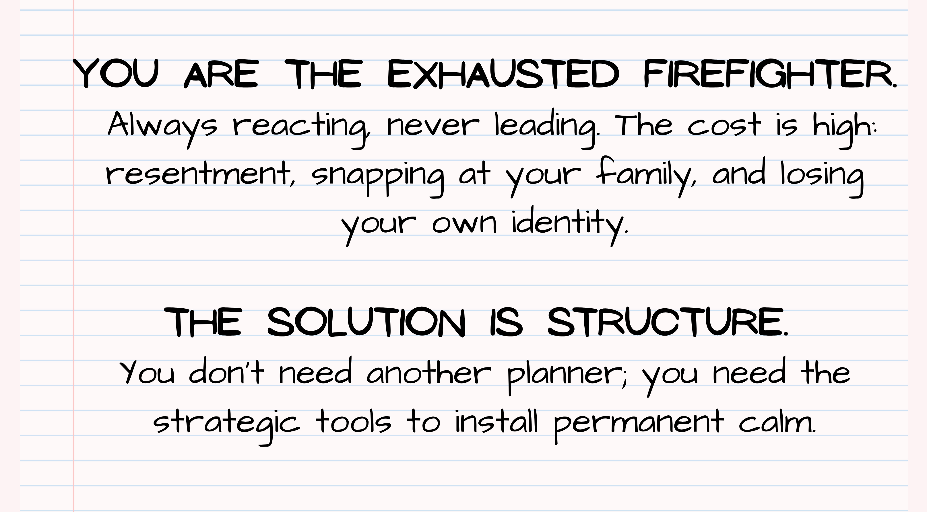 You are a high-achieving woman. We know you can do big things—the problem is, you are doing too much with no structure! You're trying to fix a structural failure with a willpower solution, and it always fails. That's why you feel guilty, resentful and exhausted.